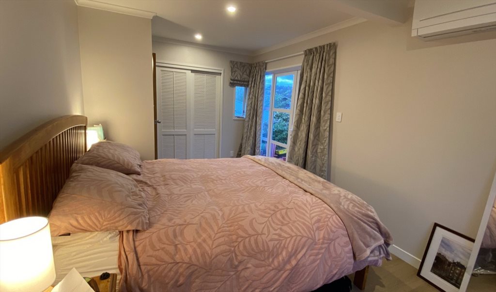 Large room with private en suite bathroom, heat pump, thermal curtains, built-in wardrobe, wall-hung TV and separate entrance that leads onto large backyard deck. There is a temperamental spa (generally works but sometimes needs TLC). Note deck, spa and garden are shared space.